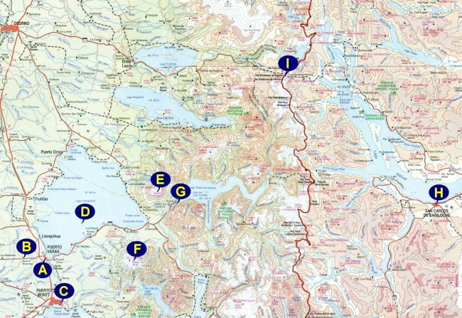 F - sopka Calbuco, G - vodopády Petrohue, H - San Carlos de Bariloche, I - chilsko-argentinský hraniční přechod